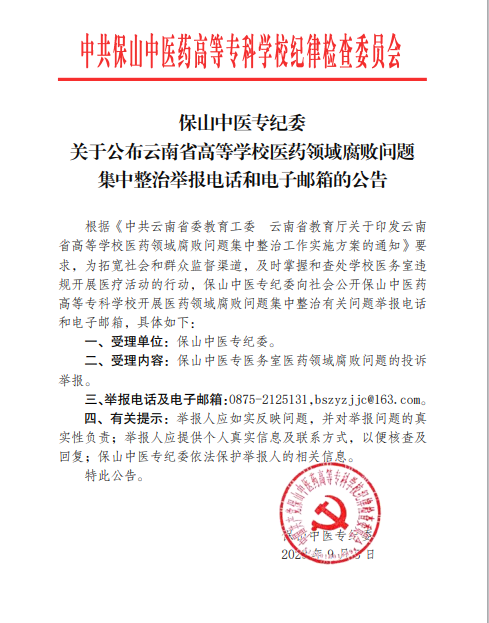 关于公布云南省高等学校医药领域腐败问题集中整治举报电话和电子邮箱的公告